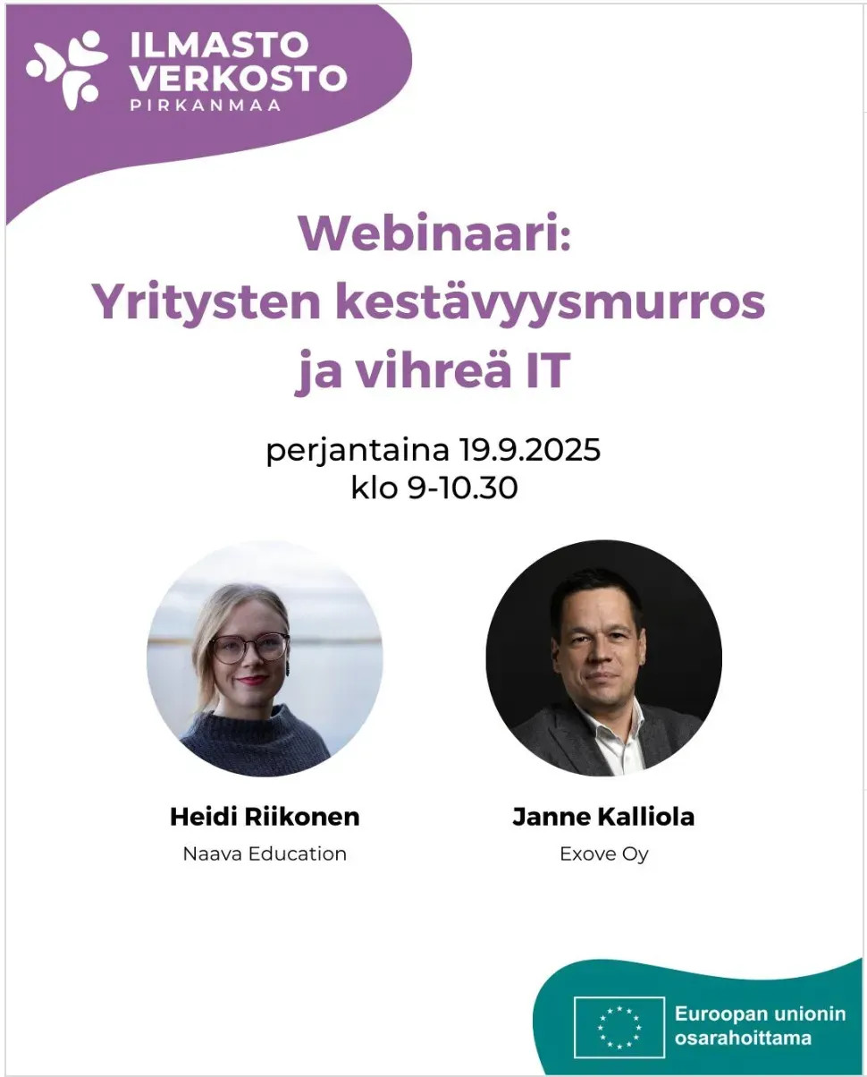 "Heidi Riikonen piti Pirkanmaan ilmastoverkoston webinaarissa esityksen kestävyysmurroksesta. Kohderyhmänä webinaarissa oli yrittäjät ja Heidin näkökulma aiheeseen oli 'Kohti kestävyyttä liiketoiminnassa'. Esityksessään Heidi avasi kestävyysmurrosta kokonaisuutena, painotti sen tärkeyttä sekä konkreettisilla yritysesimerkeillä avasi sitä, mitä murros liiketoiminnassa voi tarkoittaa. Heidi auttoi myös webinaarin sisällön suunnittelussa. Teemme jatkossakin mielellämme Heidin kanssa yhteistyötä."